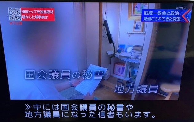 NHKの番組で、旧統一教会信者が国会議員の秘書になったり地方議員になっている例を報道しています。
