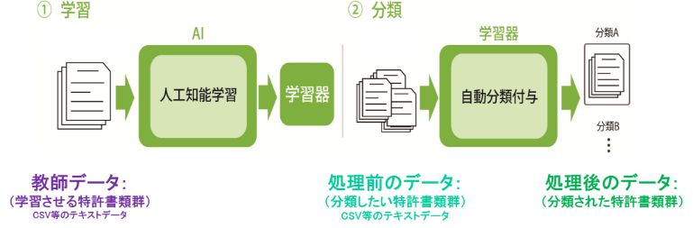 人工知能・自然言語処理技術を活用し、あらかじめ人が分類した特許群(教師データ)をAIに学習させることで